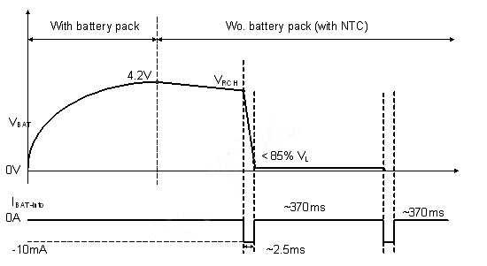 使用者亦有可能在充電或式充電完畢后,在未將電源移除的情況下,即抽離電池的情況。為避免造成危險,IC內部應具有如圖7, 8的電池存在偵測機制。充電IC會以短時間脈沖(每370ms產生2ms的脈沖)方式抽取電池電流,此時若電池存在,則偵測到的電池電壓應大于一預設閥值;若電池已切離,則充電IC偵測到一低電壓,即可判定為電池斷開狀態,并將電池端電壓切斷,保護使用者安全。