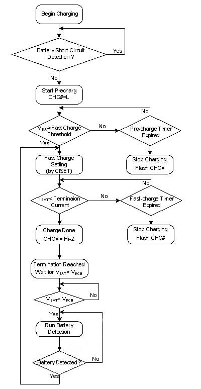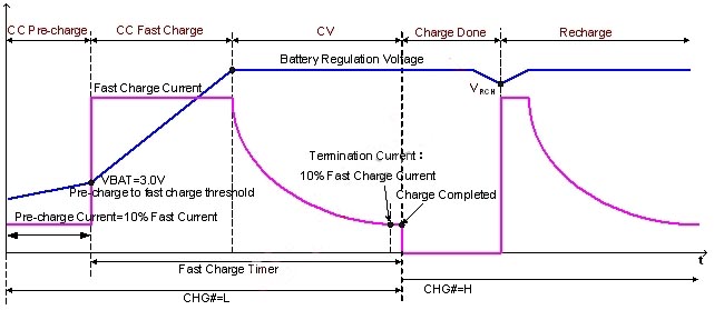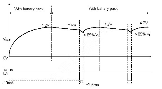 然而,當電池故障時,電池可能無法儲存電能,電壓抑不會升高,所充入的能量轉變成熱,除了依靠過溫度保護機制之外,IC內部亦具有超時計時器,無論此時電池電壓狀態如何,只要超過設定充電時間后,隨即關閉充電器,以達到多重保護使用者之功能。