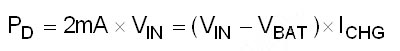假設使用5.5V電源供應器對單顆1200mAh鋰離子電池進行充電,在0.7°C快速充電電流時,且電池電壓為3V的條件下,可以預估IC運作的最大耗電量為,1.762W的耗電最大值,此一功耗會使得熱阻抗60°C /W的3×3毫米QFN封裝溫度溫升127°C,即便環境溫度0°C時,也已經超過所允許的125°C硅晶片操作溫度最大值。若設定充電電流為0.6A(0.5C),則可降低IC溫升為90度,可以操作于35度的環境溫度中,因此是較佳的設定電流。