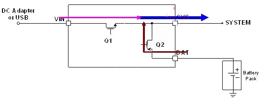LD6275具有適應性電源路徑管理(Adaptable Power Path Management, APPM)功能,其為以供給系統端用電為主,對電池充電為輔,如圖3所示;當系統用電超過輸入電源的供給限制時,其電池亦能主動開啟放電功能同時對系統端供給其所需之電能需求,如圖4所示。