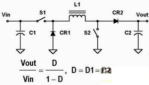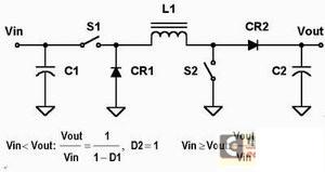 圖1a的電路盡管是四個(gè)電路中最復(fù)雜的,卻有幾個(gè)優(yōu)點(diǎn)。它的輸入和輸出電流被電感平滑處理,減小了輸入和輸出端的紋波電流以及對電容C1和C3的電流應(yīng)力。但是這一方案也有缺點(diǎn),電容C2的電流不管是當(dāng)Vin小于Vout時(shí)來自CR1還是當(dāng)Vin大于Vout來自S2,它都會(huì)有中斷,而且它需要兩個(gè)電感。