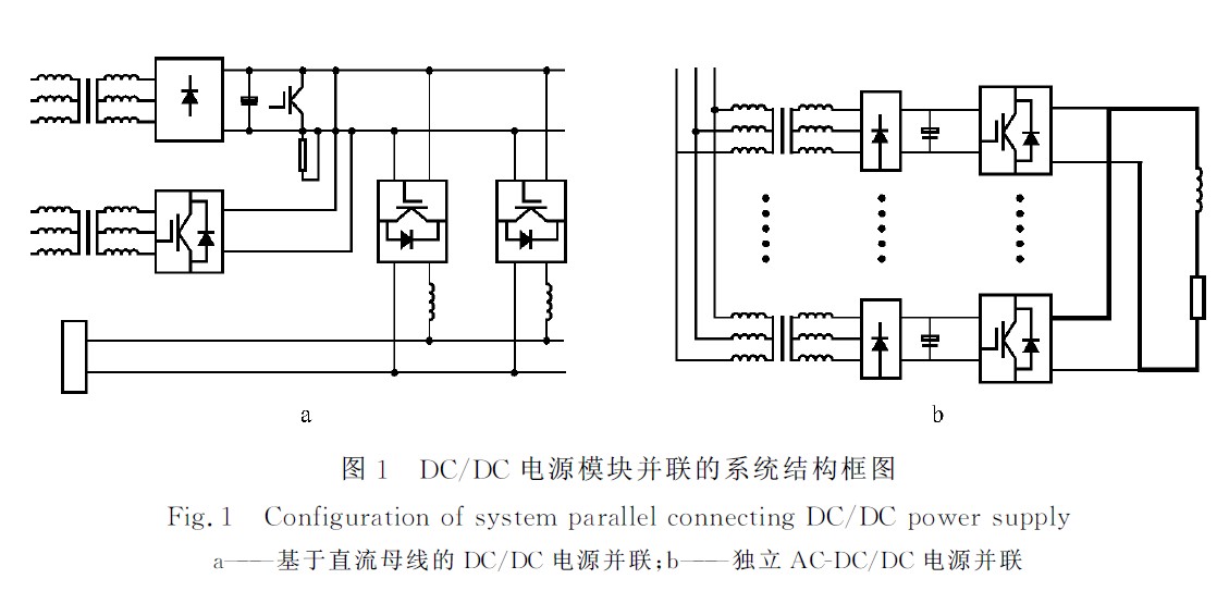 采用圖1a所示的拓?fù)浣Y(jié)構(gòu),系統(tǒng)需大容量不可調(diào)直流電源,一般可采用整流變壓器降壓,二極管整流并經(jīng)電容濾波得到。這種結(jié)構(gòu)雖可保證并聯(lián)的每條支路有共同的直流電壓輸入,避免并聯(lián)支路因直流側(cè)輸入電壓不同而帶來的不均衡,但該直流電源的容量大,電流達(dá)20KA,直流母線承受的負(fù)荷過重,前級(jí)AC-DC設(shè)備要求較高,不易實(shí)現(xiàn)。另外,輸入端共用母線不利于實(shí)現(xiàn)完全意義上的獨(dú)立電源模塊的并聯(lián)。因此,采用如圖1b所示的AC-DC/DC直流電源并聯(lián)的拓?fù)浣Y(jié)構(gòu)。