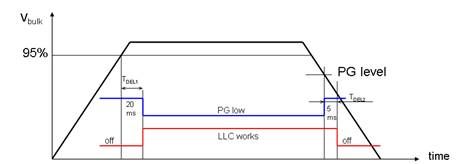 4. PFC異常檢測:PFC異常檢測的目的在于,如果PFC沒有正常工作,那么即使出現高線路電壓,PFC和LLC均應停止工作。例如,在高線路電壓時PFC驅動器電阻損毀的情況。實現PFC異常檢測保護的方法是:如果VCTRL保持在最高電平或低于最低電平,如VCTRL引腳異常短路,且時間長于1秒(tPFCabnormal),則PFCok內部信號下降,PGout引腳立即釋放開路,通知系統電源將關閉;5 ms后LLC停止工作(tDEL2)。