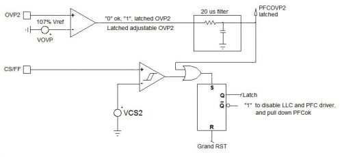 3. 冗余OVP(閂鎖):專用OVP2引腳用來保護大電容;電路中內置的20 µs濾波器用來提供更佳的噪聲免疫性。當OVP2比較器被觸發時,PFC及LLC均關閉。PFCok信號假定為低電平時,PGout被釋放開路,使LLC停止工作。