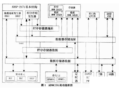 ADMC331是美國模擬器件公司(ADI)推出的基于DSP技術的電機控制器,它在內部集成了一個26MIPS(每秒百萬條指令)的定點數字信號處理器內核,同時內部還包括整套電機控制外圍線路,從而為用戶快速、高效地開發電機控制器創造了十分有利的條件。ADMC331的功能框圖如圖1所示,其主要特性如下: