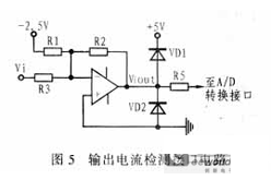 ADMC331內的A/D轉換器由7個模擬輸入通道和比較器等電路組成,數據轉換是通過判斷模擬輸入量與片內高穩定度鋸齒波的交點來實現的。考慮到A/D 轉換器能接受的電平范圍為0~+5V,因此必須將電壓互感器檢測的電壓和電流傳感器檢測的電流(轉換為電壓量)按照一定比例轉換到這個范圍內。輸出電壓和電流檢測接口電路分別如圖4和圖5所示,這部分電路的輸入阻抗應比較大,以盡量減少對設備信號的影響,并且輸出阻抗應同A/D轉換器的輸入阻抗相匹配。