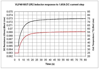 圖5中所示的測試示例在LM3554的電路中使用了VLS4010ST-2R2,直流電流階躍為1.65A。室溫時的電阻開始時為65mΩ。超過30秒之后,電感器達到穩態,電阻變為73mΩ,相應的穩態工作溫度大約為 56℃。