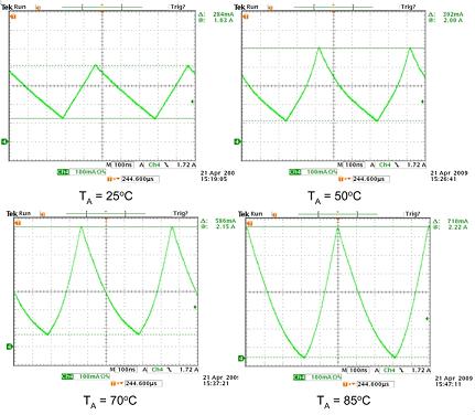 圖4左上圖顯示了在飽和點以下工作的電感器,具有正常的三角電流波形,可由(V/L×Δt)算出。在峰值電流保持相同且溫度升至50℃(右上圖)時,電感電流斜率開始增至1.76A標記附近,指示顯示電感器的飽和點隨著溫度上升而向下移動。當溫度升到70℃, 然后升到85℃時,隨著電感器達到飽和整個電流波形最終出現。