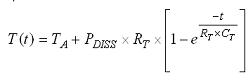 在穩態下,LEDI/NTC的ESD二極管的VF為-622mV,對應結溫 95.2℃(環境溫度為25℃時)。在穩定狀態下,測得的PFET導通電阻為154mΩ,對應結溫105℃。圖3 還描繪了LM3554的熱容。VF和RPMOS的響應表現呈現類似于一階RC的指數級上升,計算等式如下: