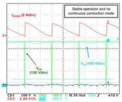 圖4顯示出現(xiàn)不穩(wěn)定性問題時(shí)高輸入線路(正弦波頂端,此處Vin約為380V)下的VAUX電壓。我們可以看到MOSFET關(guān)閉時(shí),VAUX電壓輕微躍升至高于ZCD閾值。由于其大紋波的緣故,在退磁相位期間,VAUX電壓首先增加,然后下降。由于在某些開關(guān)周期的末段VAUX接近ZCD閾值,這VAUX電壓下降導(dǎo)致零電壓比較器在電感磁芯完全復(fù)位前就翻轉(zhuǎn)(trip)。圖5證實(shí)了這一論斷。有時(shí),升壓二極管仍在導(dǎo)電時(shí),PFC段開始新的周期。這個(gè)現(xiàn)象主要導(dǎo)致線路電流失真(見紅色跡線)、功率因數(shù)退化,并可能有一些頻率處在人耳可聽到的噪聲。