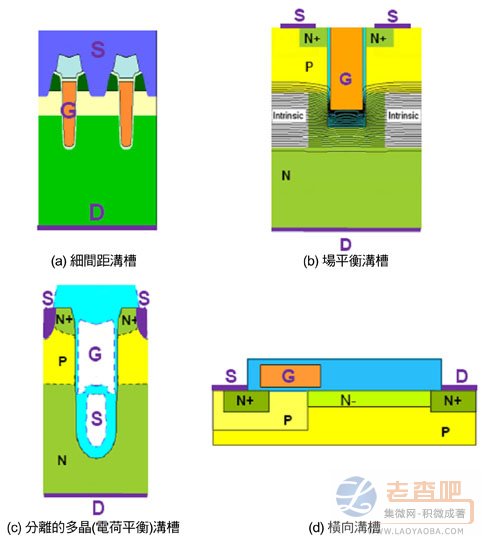 圖1標示出目前常用的多種功率MOSFET元件結構。圖1a中所示的高密度溝槽結構采用較低的Sp.RDS(on),但QG和QGD較高,因為此兩個參數與單元密度成正比。此種結構通常用于開關損耗較無重要性的應用中(如電池保護)。可透過加大單元間距、于溝槽底部加上厚氧化膜以改善此結構的開關性能。