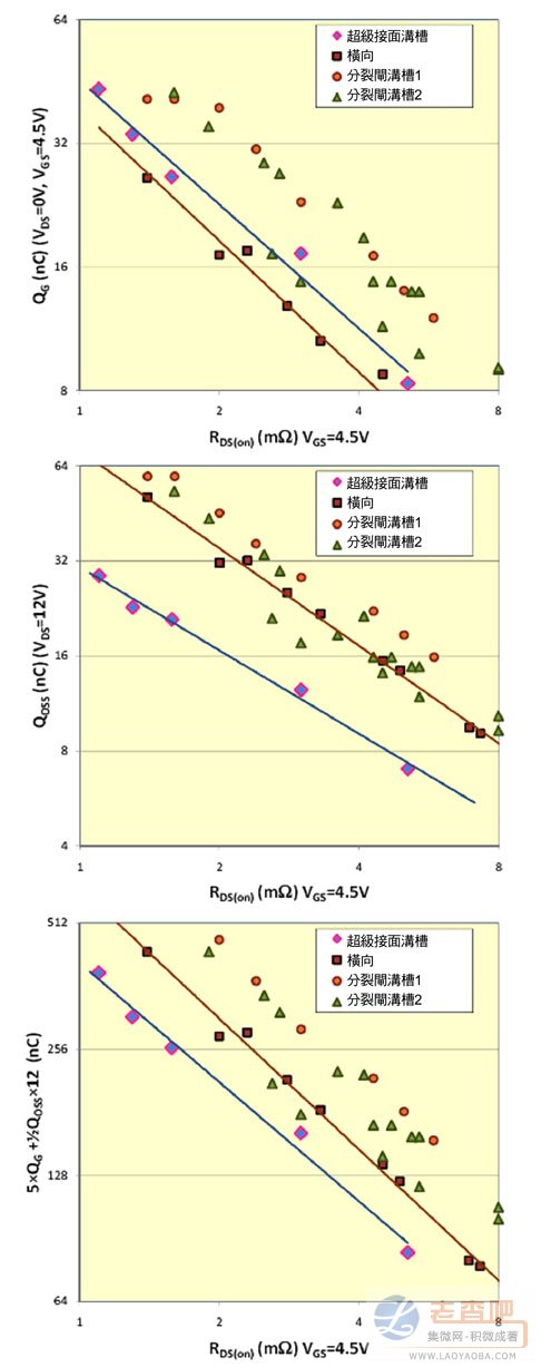 選擇功率MOSFET結構的重要因素,在于考量該結構是否有助于提高元件性能。若選用橫向或分裂閘結構,須考慮在低側元件應用中,是否值得為獲得低QGD和QG而犧牲QOSS性能。這些達成最佳化的結果如圖3下半部分所示,QOSS和QG使用5伏特閘極驅動電壓和12伏特轉換電壓進行組合。顯然對于同步FET而言,超級接面結構因其固有的低QOSS而具備最佳的綜合性能。此結果表明,僅藉由達成最佳化已不足以獲得最低QG和QGD FOM。這種情況更足以證明,溝槽結構中閘極電荷已降至相當低,QG不再扮演低側元件開關損耗的主要因素。