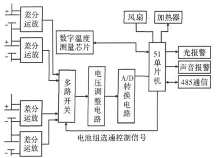 具有高電壓、高容量、循環壽命長、安全性能好等優點的鋰離子電池,在便攜式電子設備、電動汽車、空間技術、國防工業等多方面具有廣闊的應用前景。由若干節鋰離子電池經串聯組成的動力鋰離子電池組目前應用最為廣泛。由于每節單體電池的電壓不一致,使用中電池不允許過充電、過放電,電池的性能和壽命受溫度影響較大等特點,必須對串聯鋰離子電池組進行監測,確保在使用中鋰離子電池具有良好的狀態,或者使用中電池出現問題立即報警,電源管理系統立即采取保障措施,并提醒相關人員檢修。單體電壓和電池組的溫度是辨別串聯鋰離子電池組是否正常工作的主要技術指標。采用直接采樣法,將要測量的單體電池電壓存儲在非電容上進行測量。該方法反應時間慢、誤差較大、控制復雜; 采用運放和光藕繼電器來測量串聯電池組的單體電壓。該方法對光耦的線性度要求很高,導致硬件成本較高。目前,直接采用集成芯片的串聯鋰離子電池組監控系統受到青睞,但該方法串聯電池的數目固定,導致應用不靈活、硬件成本高等缺點。文中研制了一種動力鋰離子電池組監測系統,對串聯鋰離子電池組的單體電壓和電池組的溫度進行在線監測,當單體電池電壓偏離規定區間時,監測系統啟動報警程序進行聲、光報警; 當電池組溫度偏離規定的區間時,監測系統啟動風扇或加熱控制電路,并存儲有關數據,確保電池組正常工作。整個監測系統具有連續測量分量、簡單經濟、精度高和可靠性高的特點。