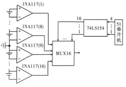 每節鋰離子電池最高電壓為5 V,由圖3 可得,第1 個INA117 的3 腳的輸入電勢最高為40 V.同理,第16 個INA117 的2 腳輸入電勢最低為- 40 V.第1 至8 個INA117 的輸出電壓為正,第9 至16 個INA117 的輸出電壓為負,所以多選一模擬開關和A/D 轉換器都要求可以輸入正、負電壓。多選一模擬開關選用MUX16,為16 選1 可正負電壓輸入模擬開關,因此16節電池只需1 個MUX16.但由于單片機IO 口有限,文中用一片74LS154 擴展了IO 口,僅用單片機的4 個IO 口即可控制MUX16 分別選通單節鋰離子電池進行電壓采樣。