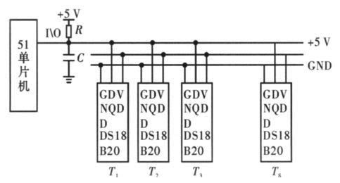 針對串聯電池組,傳統的測溫方法多采用模擬溫度傳感器進行測量,在數據的采集和傳輸過程中易受外界環境的干擾,從而使測得的結果誤差較大,且當測量點較多時,連線較復雜。文中采用單片機和單總線數字式溫度傳感器DS18B20 來解決上述問題。其原理如圖5 所示。
