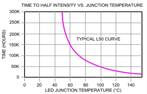 每種照明設備均存在光源使用壽命問題,經常遭遇的狀況有類似白熾燈泡的鎢絲突然燒斷,或因長時間使用而使得光源材料因逐漸老化以致變暗而故障,LED亦因組件的接面溫度而出現老化現象。所有的照明設備在提供穩定亮度條件下,于一定使用年限后,亮度勢必會逐漸低于有效亮度之下。在不同的照明應用裝置中,皆有使用壽命時間限制。舉例來說,當使用在路燈裝置的亮度已衰減至原先50%時,即代表使用年限,但使用在醫生內視鏡的光源裝置可能亮度尚未衰減那么多。
