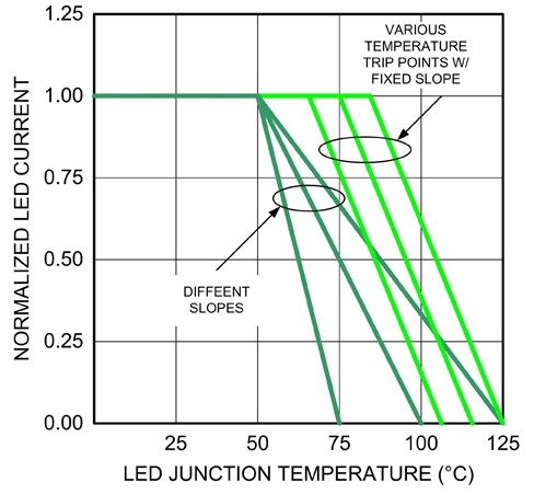 為防止組件遭受破壞或讓使用壽命縮短,必須進行熱能管理,且已有多種方法可以解決此問題。圖2為兩種不同的回折曲線,可在溫度上升時限制LED的電流流量。當接面溫度保持在默認溫度范圍內時,就經由主要的控制回路作為電流調節;但當接面溫度超過默認范圍時,就會使用另一組控制回路限制電流大小。其中接面溫度的回折點與驅動電流的衰減率,均可依照不同的應用和LED制造商的建議改變。