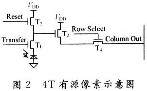 轉移管T1被用來將光敏二極管連接至源跟隨器T3,并通過復位管T2與VDD相連。T3的柵極與T1和T2之間的N+擴散區相連。與3T結構的APS相比,減少了與T3的柵極相關的漏電流效應。源跟隨器T3的作用是實現對信號的放大和緩沖,改善APS的噪聲問題。T4是用來將信號與列總線相連。其工作過程是:首先進入“復位狀態”,T2打開,對光敏二極管復位;然后進入“取樣狀態”,T2關閉,光照射到光敏二極管上產生光生載流子,并通過源跟隨器T3放大輸出;最后進入“讀出狀態”,這時行選通管T4打開,信號通過列總線輸出。