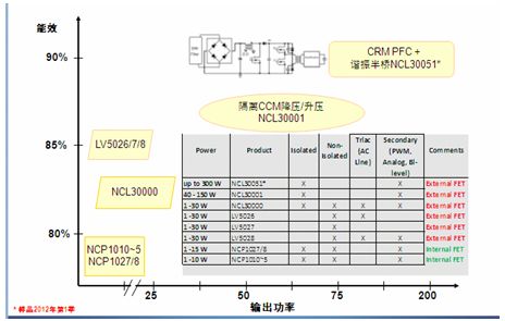 在安森美半導體用于LED照明的AC-DC電源方案中,1至10 W的照明應用中推薦使用NCP1010~5,1至15 W可使用NCP1027/8,這些方案集成了MOS管,適用于隔離和非隔離應用,支持次級PWM調光、模擬調光或雙亮度等級調光,能效高達75-80%;1至30 W的應用可以使用LV5026、5027、5028,支持隔離方案,典型能效85%左右;1至40 W推薦使用NCL30000,可進行初級可控硅調光,適用于隔離和非隔離方案,隔離方案能效80-85%。40至150 W推薦使用NCL30001,它是一個連續導電模式(CCM)控制芯片,隔離方案的典型能效85-90%;更大功率推薦使用NCL30051。圖2是這些方案輸出功率與能效的對比。以下將具體介紹這些方案的功能和特點。