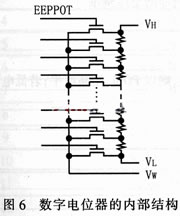 數(shù)字電位器的內(nèi)部結(jié)構(gòu)如圖6所示,它用控制MSO管的開關(guān)來調(diào)節(jié)滑動(dòng)端VW在VH和VL之間多個(gè)等值電阻的位置,抽頭數(shù)越多,等值電阻越多。調(diào)整的范圍越寬,對DC-DC變換器的輸出電壓調(diào)整幅度越小。