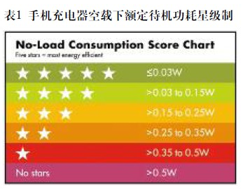 這些關注的結果是采取一系列措施來提升效率和降低空載功耗的需求。其中最新最嚴格的是由全球前五大手機廠商提出的一項自愿性的充電器星級制協定,用以標志在充電完成之后,充電器仍插在壁式插座上時的耗能量。該星級制從0星級開始,最高5星級。空載下額定待機功耗大于0.5W的充電器為0星級標簽,待機功耗小于0.03W(30mW)的為5星級(見表1)。通過比較,大多數現有手機的待機功耗在150~300mW范圍。