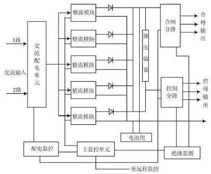智能高頻開關(guān)電源系統(tǒng)的總體結(jié)構(gòu)主要由主監(jiān)控單元、配電模塊、交流配電單元、整流模塊等組成, 系統(tǒng)總體的結(jié)構(gòu)圖如圖1 所示。系統(tǒng)中的各個監(jiān)控單元受主監(jiān)控單元的管理和控制,通過通信線將各個監(jiān)控單元采集的信息送給主監(jiān)控統(tǒng)一管理。主監(jiān)控顯示直流系統(tǒng)各種信息,用戶也可以觸摸顯示屏查詢信息及操作,系統(tǒng)信息還可以接入到遠程監(jiān)控系統(tǒng)中。系統(tǒng)除了交流監(jiān)控、直流監(jiān)控、開關(guān)量監(jiān)控等基礎(chǔ)單位外,還配置了絕緣監(jiān)測、降壓裝置、電池巡檢等功能單元,以達到對直流系統(tǒng)進行全面監(jiān)控的目的。
