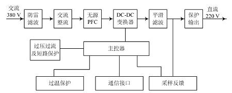 本文設(shè)計的整流模塊的工作原理框圖如圖2 所示,工作時, 模塊首先通過過防雷處理和濾波對輸入的三相交流進行處理,這樣才能保證模塊后級電路的安全; 經(jīng)過處理后的三相交流經(jīng)過整流和無源PFC 后轉(zhuǎn)換成高壓直流時,這時轉(zhuǎn)換的高壓直流要經(jīng)過DC/DC變換器再次轉(zhuǎn)換成可變的直流電壓輸出; 另外模塊控制部分還有負責過壓、過流以及短路保護等作用,這樣才能保證輸出電壓的穩(wěn)定, 也同時能對模塊各部件進行保護。模塊還在遠程監(jiān)控中提供了 四遙 (遙控、遙調(diào)、遙測、遙信) 接口。[page]