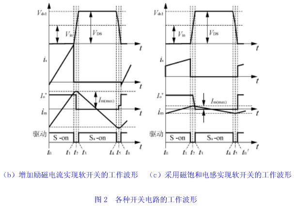 為了克服上述零電壓軟開關工作時電流應力過大的缺點??梢栽谧儔浩鞔渭壵鞫O管上串聯一個磁飽和電感ls,如圖1所示。當電壓vds1下降到vin時,[t5~t0′]期間磁飽和電感ls瞬時阻斷整流二極管,使得變壓器勵磁電流不必負擔負載電流,而可完全用來給電容cds2、cds1充放電。這樣,不必大量減小變壓器勵磁電感,較小的勵磁電流就可以保證電壓vds1諧振到零,實現主功率開關管的零電壓軟開通。關鍵工作波形如圖2(c)所示。