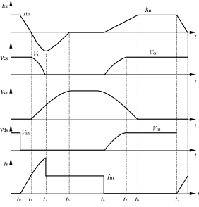 從t5開始,vcs被鉗在VO,即VCsmax=VO;電源繼續經L,Lr,Cr,D3向負載供電,電容Cr繼續放電。t=t6時,電容電壓vcr降到零,同時電感電流iLr上升到Iin,iLr=Iin,簡化電路如圖2(g)所示,波形圖如圖3所示。