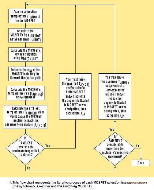 再參考圖1說明,確定是否正確選擇了用于同步整流器和開關MOSFET的MOSFET迭代過程的下一個步驟。這一步驟計算每個MOSFET的環境空氣溫度,它可能導致達到假設的MOSFET結溫。為此,首先要確定每個MOSFET的結與環境間的熱阻(ΘJA)。