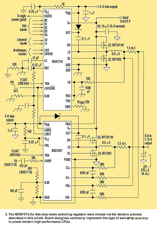 在室溫下組合的最大RDS(ON)為6mΩ,在115°C(假設的TJ(HOT))為8.7mΩ的兩個并聯IRF7811WMOSFET組成開關MOSFET。組合CRSS為240pF。MAX1718以及MAX1897的1Ω柵極驅動輸出約為2A.。當VIN=8V時,電阻損耗為0.57W,而開關損耗約為0.05W。在20V時,電阻損耗為0.23W,而開關損耗約為0.29W。在每個操作點的總損耗大體平衡,而在最小VIN處的最壞情況下,等于0.61W。