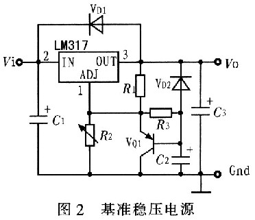 LM317是美國國家半導體公司的三端可調正穩壓器集成電路,輸出電壓范圍是1.2~37 V,負載電流最大為1.5 A,使用簡單。其工作過程如下:輸出電壓Vout通過R1、VQ1,對C2充電,開始時VQ1飽和導通,Vout最低(約1.5 V)。隨著C2上電壓的升高,VQ1逐漸退出飽和并趨于截止,Vout逐漸升高至額定電壓。改變R1、C2的常數可改變軟啟動的時間。改變可變電阻R2的值,可調整輸出電壓Vout的值。VD1用于關機后使C2上的電荷快速泄放。其輸出電壓為: