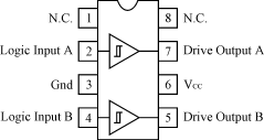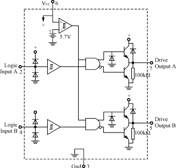 MC34152的外圍電路簡(jiǎn)單,應(yīng)用方便。它是8管腳的同相推挽驅(qū)動(dòng)芯片,具體的內(nèi)部結(jié)構(gòu)和封裝如圖4所示。腳2與腳4為兩路控制信號(hào)輸入,經(jīng)過(guò)芯片內(nèi)部的推挽放大,直接輸出同相的兩路驅(qū)動(dòng)信號(hào)(腳7及腳5)。為使芯片更加穩(wěn)定地工作,一般在芯片的電源端并聯(lián)一個(gè)濾去高頻干擾的瓷片電容和一個(gè)濾去低頻干擾的電解電容。