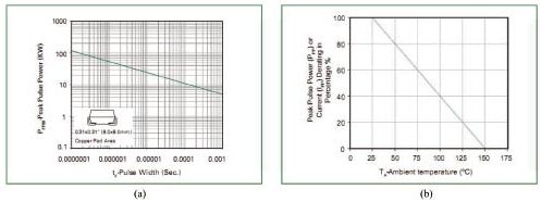 對(duì)瞬變電壓的吸收功率(峰值)與瞬變電壓脈沖寬度間的關(guān)系。手冊(cè)給的只是特定脈寬下的吸收功率(峰值),而實(shí)際線路中的脈沖寬度則變化莫測(cè),事前要有估計(jì)。對(duì)寬脈沖應(yīng)降額使用。