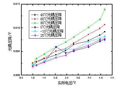 光電繼電器部分的檢測誤差不僅隨著溫度變化,同時也隨著被測量的電壓值變化,從圖3中可以看到,同一測量溫度下,1V與4V的被測量電壓之間的測量誤差達到12mV。從圖5中可以看到,而采樣系統的誤差僅僅同溫度有關,而與被測量電壓值無關。