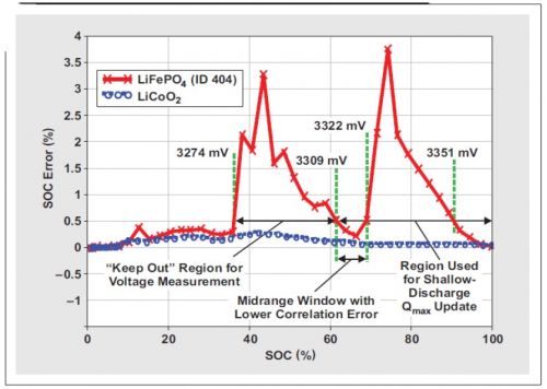 如表 1 所示,化學(xué) ID 404 的 OCV 測量的不合格電壓范圍為 3274mV(最小值,即 ~34% SOC)到 3351mV(最大值,即 ~93% SOC)。大多數(shù)磷酸鐵鋰電池都有非常寬的不合格電壓范圍(參見化學(xué) ID 409 進(jìn)行對比)。然而,根據(jù)具體的電池特性,為淺放電 Qmax 更新找出一個(gè)更高的最小不合格電壓是可能的。化學(xué) ID 為 404 時(shí),將這一值升高至 3322mV 是可能的,從而允許 3309 到3322 mV 的淺放電 Qmax 更新窗口(請參見圖 2)。設(shè)計(jì)人員可以使用這種中間范圍低誤差窗口,實(shí)現(xiàn)數(shù)據(jù)閃存修改。由于僅能對高和低不合格電壓范圍進(jìn)行設(shè)定,因此主系統(tǒng)必須保證在 3309mV 以下不會(huì)進(jìn)行更低的 OCV 測量。(隨著關(guān)聯(lián)誤差的增長,OCV 測量誤差在 3274 和 3309mV 之間急劇增加。)雖然僅有一個(gè) 13-mV 窗口在更低 OCV 測量時(shí)起作用(3322 – 3309 mV = 13 mV),但其對應(yīng)于一個(gè) 70% 到 64% 的 SOC 范圍。