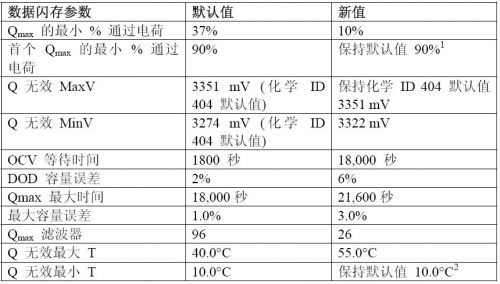 表 2 顯示了電量計(jì)評(píng)估軟件中典型的數(shù)據(jù)閃存參數(shù),必須對其進(jìn)行修改以實(shí)現(xiàn)淺放電 Qmax 更新。這些特殊參數(shù)均為受保護(hù)(歸為“隱藏”類),但可以由 TI的應(yīng)用人員解鎖。本表格所用舉例電池組為前面所述電池組,其為一種使用A123 1100-mAh 18650 LiFePO4/碳精棒電池(化學(xué) ID 為 404)的 3s1p 電池組。