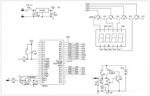 在實(shí)際電路中,L1就是第一只數(shù)碼管的共陽極端。單片機(jī)的輸出、輸入接口數(shù)量都很有限,所以4位LED數(shù)碼管驅(qū)動都是使用動態(tài)顯示的方式。4只獨(dú)立數(shù)碼管LED的內(nèi)部a、b、c、d、e、f、g、dp這8段發(fā)光管相對應(yīng)的陰極都是并連的。統(tǒng)一由單片機(jī)P0口8位輸出進(jìn)行驅(qū)動。數(shù)碼管要顯示出數(shù)碼還必須在共陽極端同時施加正電壓才行。所以要讓4位中某一數(shù)碼管進(jìn)行顯示,只要在P0口輸出字型碼的同時,給這位數(shù)碼管共陽極端加上正電壓就行了,當(dāng)然與此同時其他三位數(shù)碼管的共陽極端要保持低電壓,才不致顯示出現(xiàn)混亂。數(shù)碼管共陽極端驅(qū)動電流較大,所以采用了三極管進(jìn)行控制。以第一只數(shù)碼管為例,在P0端口輸出字型碼的同時,P37輸出低電平,三極管T4導(dǎo)通,則共陽極端L1就得到高電平了,數(shù)字就會顯示在第一只數(shù)碼管上了。