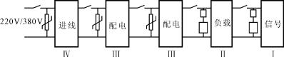 從圖1可以看出,在220V/380V線路中的每一區(qū)域,都應(yīng)該在其前面并聯(lián)氧化鋅壓敏電阻器或過電壓保護器,雷電感應(yīng)過電壓能量將通過逐級的防雷器件吸收和釋放到大地中,達(dá)到保護線路和設(shè)備免受雷電破壞的目的;雖然應(yīng)用于Ⅳ、Ⅲ區(qū)域的過電壓保護器具有自身劣化斷開電源的功能,但考慮到不同的接地狀況,還應(yīng)與過電壓保護器串聯(lián)合適的熔斷器或空氣開關(guān).