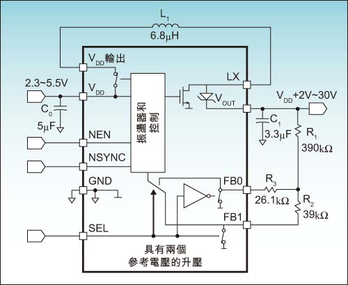 如上所述,當(dāng)OLED工作在暗的模式時可以通過降低輸出電壓顯著地節(jié)省功耗。因此為OLED電源選擇的最佳電源芯片應(yīng)包含能夠提供這一功能的電路。采用兩條獨立的反饋路徑就可實現(xiàn)這一功能,而且這兩條反饋路徑可以通過簡單的邏輯輸入進行選擇。因此通過這種方法就可簡單地實現(xiàn)PMOLED中使用的亮→暗→關(guān)節(jié)電技術(shù)。