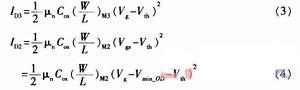 接下來將分析VM2、VM3和VM4組成的網絡如何確保Vmin_OD大于0。分析電路可知,VM2、VM3工作在飽和區,VM4工作在線性區,因此ID3>ID4,ID4=ID2。
