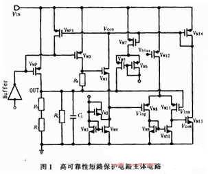 同時當短路發生時(即Vcon信號為低電平),VM7管正常工作,VM5管將導通,有一定的電流流向0UT端;因此一旦短路消除(即0UT端接有負載電阻),VM5管將對負載電容和負載電阻組成的并聯RC網絡充電,0UT端電壓升高,Vcon信號將變為高電平,電路自動恢復正常狀態。