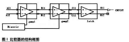 它由兩級結構相同的前置放大器和一級帶有復位再生的高速鎖存器組成,每一級中都帶有一個內置正反饋的設計。前置放大器使輸入的變化足夠大,并且將其加載到鎖存器的輸入端,這樣獲得電路的最佳特性。