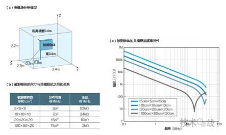 利用尺寸各異的4種對(duì)象物進(jìn)行了電磁場(chǎng)解析模擬,計(jì)算出了從人工電源網(wǎng)絡(luò)觀察被測(cè)物體時(shí)的共模阻抗(a)。根據(jù)結(jié)果可知,形狀越大,屏蔽室基準(zhǔn)面與被測(cè)物體的分布電容越大,共模路徑的阻抗就越低(b)。另外,頻率越高,共模阻抗越低(c)。