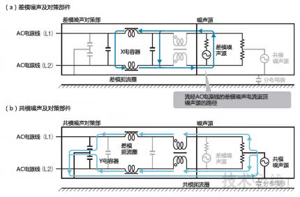 利用差模扼流圈能提高AC電源線的阻抗,使噪聲電流不易流動(dòng)。然后在此基礎(chǔ)上,利用X電容降低AC電源線間的阻抗,使噪聲電流返回噪聲源。該方法可防止電磁噪聲傳導(dǎo)至產(chǎn)品以外。