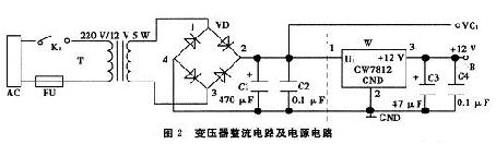 變壓器整流電路和穩壓電源電路(如圖2虛線左邊所示),其主要由變壓器、二極管橋式電路、電容構成。其中變壓器采用常規的鐵心變壓器,并將公共電網中的220 V交流電變為12 V交流電,再通過二極管橋式電路進行整流和電容C1濾波。整流信號由VC1引出。在此基礎上再接三端穩壓器CW7812及電容C3、C4(如圖2虛線右邊所示),這樣整個電路就構成穩壓電源電路。由B點提供+12 V的直流電壓。