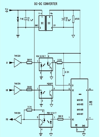 • rs-485采用DC/DC電源模塊與光耦隔離