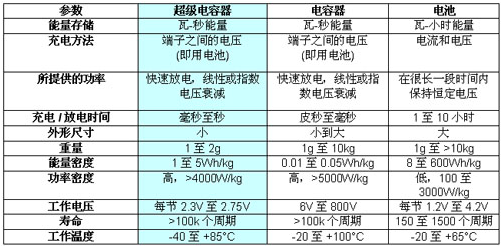 與電池相比,超級電容器能提供更大的峰值功率,具有更小的外形尺寸,在更寬的工作溫度范圍內(nèi)具有更長的充電周期壽命,還具有更低的等效串聯(lián)電阻 (ESR),可提供更高的功率密度。與標(biāo)準(zhǔn)陶瓷、鉭或電解質(zhì)電容器相比,超級電容器以類似的外形尺寸和重量,提供更高的能量密度。通過降低超級電容器的 Top-Off 電壓,并避開高溫 (>50°C),可以最大限度地延長超級電容器的壽命。下表 1 比較了超級電容器、電容器和電池的關(guān)鍵特點。