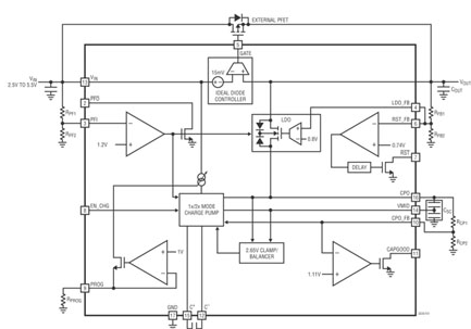 任何可高效地滿足上述小到中電流超級電容器充電器 IC 設(shè)計限制的解決方案都會包括一個面向兩節(jié)串聯(lián)超級電容器和基于充電泵的充電器以及自動容量平衡和電壓箝位。凌力爾特已經(jīng)為這類應(yīng)用開發(fā)出了一個簡單但尖端的單片超級電容器充電器 IC,該 IC 不需要電感器,也不需要平衡電阻器,提供了反向隔離,并有多種工作模式,而且靜態(tài)電流還很低。