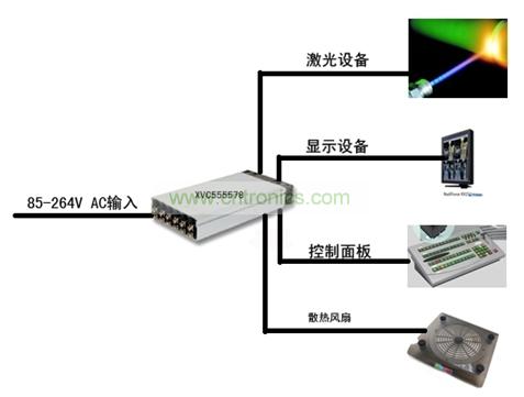 設備總功率約為1,100W,滿足醫療設備認證,需要四組不同直流輸出,首先是大電流的48V、20A用于激光設備, 其次需要一個18V用于LCD顯示器,再次需要一個5V用于控制面板,最后還需要一個12V用于系統散熱風扇。這個客戶找了很多品牌的產品都無法定型,因為電源系統太復雜,價格太高,占用的空間太大,最后他選擇了Excelsys,在40.5×260×127mm(1U高)的封裝內解決了問題。